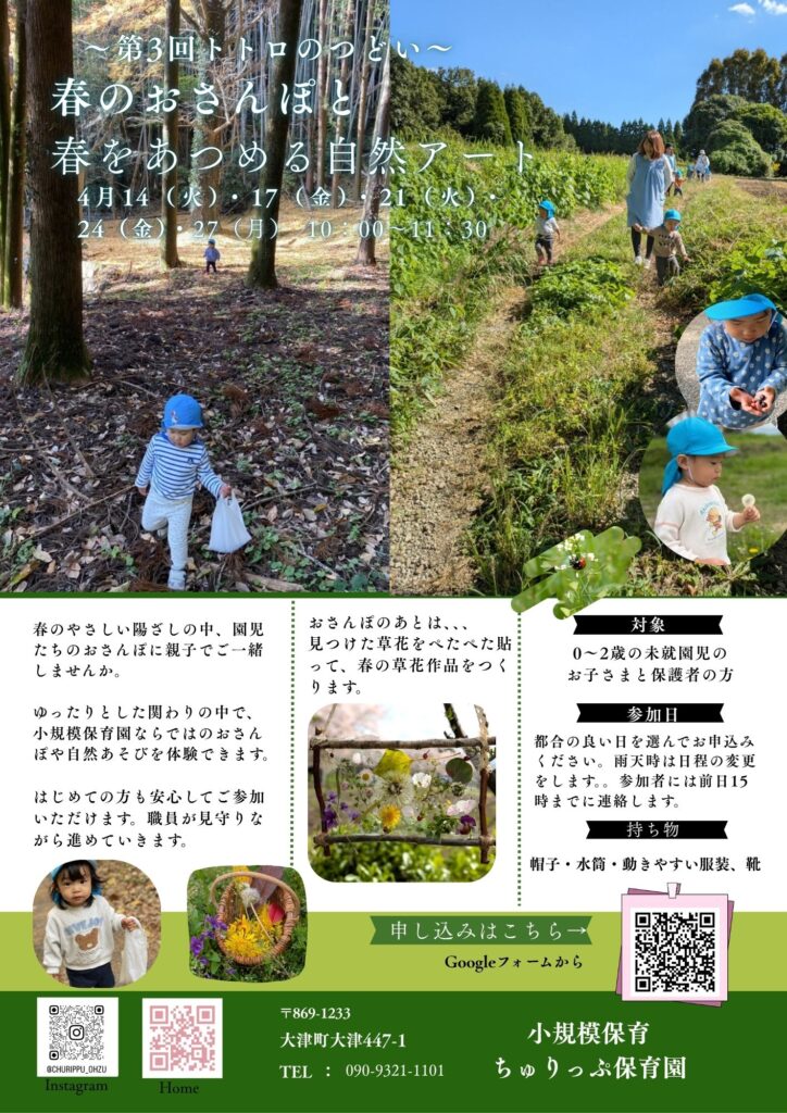 ブログ 春のおさんぽ&春をあつめる自然アートにきませんか? 2026.04.10 こんにちは!大津町小規模保育ちゅうりっぷ保育園です。 おさんぽが大好きな💛園長のさとちゃんです。 4月のトトロのつどいのチラシができました。 トトロのつどいは、012歳の未就園児の親子がほっとできる時間、 楽しめる時間を過ごす、ちゅうりっぷ保育園の集まりです。 ぜひ、気軽に遊びに来てくださると嬉しいです。 Tweet Share Hatena 0.1.2歳でもこんなにおでかけができる、 小規模保育の魅力 前の記事